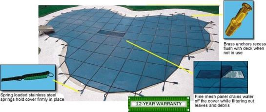 Our solid safety covers are packed with the same quality as our mesh covers except they are made with waterproof reinforced vinyl. The center of our solid safety cover has a square mesh panel that allows the cover to drain while trapping leaves and debris. The cover has all the safety features as our mesh safety cover and can be custom built to fit almost any pool.