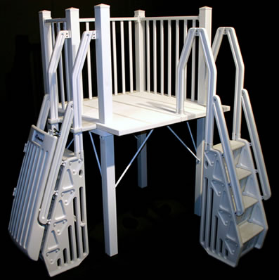 The deck can be used as an end deck or side deck and will fit almost any pool. Its unique cantilever design eliminates gaps between the deck and top rail. Both in-pool and ground-to-deck ladders are included. The ground-to-deck ladder has a self-latching gate that bars unauthorized entry. The in-pool ladder has anti-entrapment wings to prevent accidental drowning. (Both ladders meet all local and national codes for entrapment.)