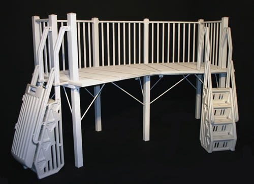 The deck can be used on all round pools from 18 to 30 in diameter. It can also be used as an end deck on 18 wide oval pools and wider. Its unique cantilever design eliminates gaps between the deck and top rail. Both in-pool and ground-to-deck ladders are included. The ground-to-deck ladder has a self-latching gate to keep out unauthorized swimmers. The in-pool ladder has anti-entrapment wings to ensure no swimmer gets entangled under the ladder, preventing drowning. (Both ladders meet all local and national codes for entrapment.)