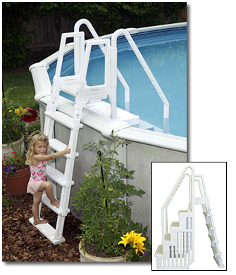 The Easy Pool Step system features our rugged step that will fit any pool up to 54” deep; and makes getting out of your pool easy and safe. Attached to the step is our classic ladder that swings up and can be locked for safety. Both the Easy Pool Step and the classic ladder can support up to a 300 pound swimmer. They are made of corrosion-proof polyethylene for years and years of use. The step and ladder system is easy to install and operate.