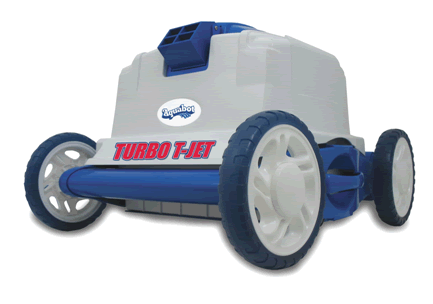 It is entirely safe and runs on 24 volts. The cost to operate is only pennies a day. It is designed to work on any type of pool including vinyl, fiberglass and concrete. Its automatic guidance system insures complete coverage of any pool shape or configuration. It is lightweight – weighs only 11 lbs – means it is easy to remove from your pool. Put an automatic power washer in your pool this year with Aquabot™ Turbo T-Jet. T-Jet comes complete with transformers and 51 ft of floating cable.
