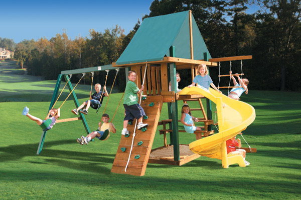 These wooden swing sets include all pre-cut, pre-sanded, and pre-drilled lumber as well as all required hardware, swing set accessories, slide, and detailed instructions required to assemble the swingsets. Our Swing sets are designed with a childs safety in mind yet they still provide a challenging and fun recreational setting.