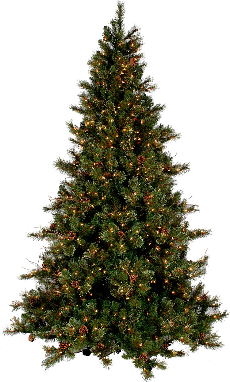 Rich looking, densely packed pine with a lustrous cashmere look complete with pine cones and natural vine. Classis Christmas tree shape has a slightly narrow profile that fits in tighter spots. The mixed needle branches and unique layered construction gives this tree a soft, natural look. The cashmere pine comes with clear lights and features: