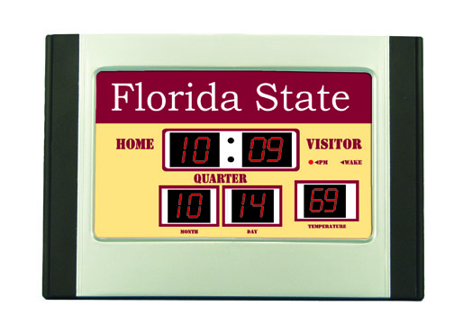 This is a cool looking mini-sized alarm scoreboard clock. Shows the time, date, and temperature and features eight different alarm settings. Measures 6.25"x9.5"x3.5" . Normally ships in 3-5 business days.