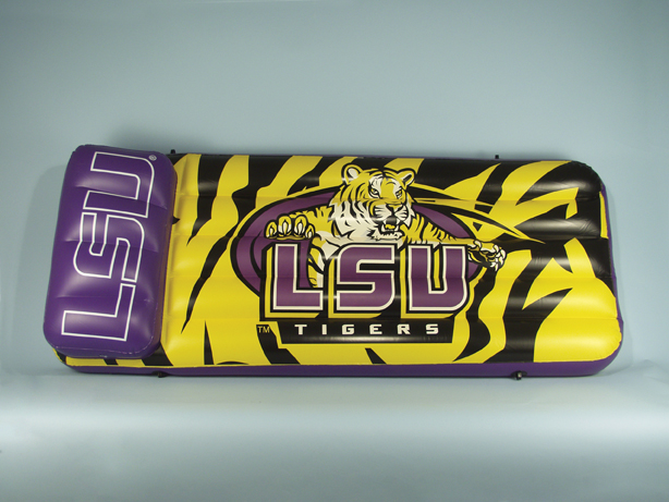 LSU Inflatable Swimming Pool Float This 66"x27"x5" Pool Float and Air Mattress is perfect for the beach, pool, or lake. It comes with built in grommets to tie up the lounger. Sturdy I-Beam construction features .25mm polyvinyl and built in angled air pillow with separate air valve.