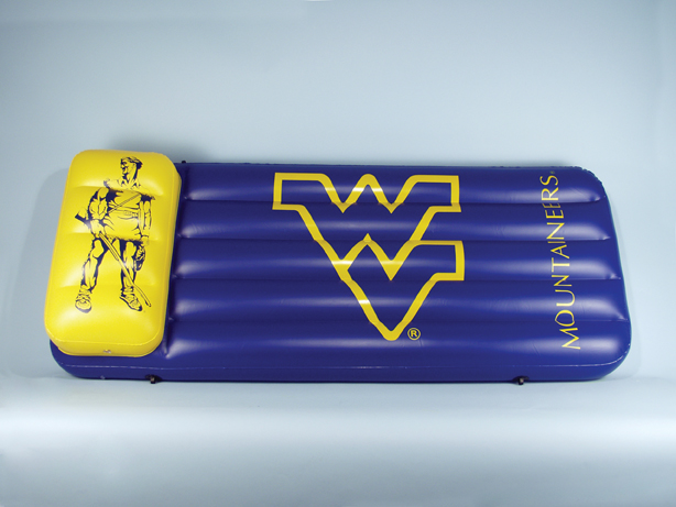 West Virginia University Inflatable Swimming Pool Float This 66"x27"x5" Pool Float and Air Mattress is perfect for the beach, pool, or lake. It comes with built in grommets to tie up the lounger. Sturdy I-Beam construction features .25mm polyvinyl and built in angled air pillow with separate air valve.