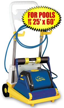 AUTOMATIC SWIMMING POOL CLEANER FOR SMALL COMMERCIAL POOLSThis rugged computerized robotic dynamo cleans, scrubs, and puts debris in it's own self-contained filter system. The Dolphin HD will clean any shape or type of pool up to 1500 sq. ft. and scrub it free of dirt, algae, and bacteria. It climbs walls to the waterline, maneuvers around ladders, drains, and stairs, and shuts itself off automatically once the pool is clean. Because it has its own filtration system, it purifies up to 4,750 gallons per hour while it helps to distribute your pool chemicals. Dolphin HD will spotlessly clean up to a 25'x60' pool. Since the HD traps debris in it own filter bag, it will never clog your pool filter or cause you to backwash.