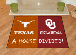 Unviersity of Texas Versus University of Oklahoma A House Divided RugCustom made, these 34" x 44.5" rugs will look great in your home.or office Chromojet printing allows full color penetration down the tuft of yarn.