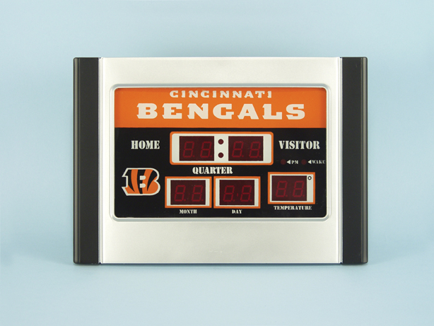 This is a cool looking mini-sized alarm scoreboard clock. Shows the time, date, and temperature and features eight different alarm settings. Measures 6.25"x9.5"x3.5" and typically ships in 3-5 business days.