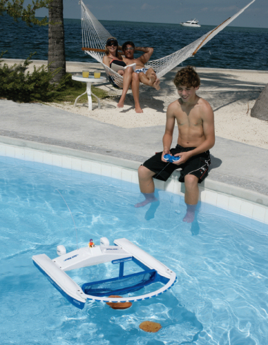 This speedy boat tools around your pool and picks up leaves, bugs, seeds and anything else on the surface and captures it in the enclosed net. Simply lift the skimmer net from the boat to clean and reinstall for more cleaning. Jet Net is battery powered by a heavy duty rechargeable NI-MH battery (battery & charger included). Jet Net operates up to 5 hours before recharging and will operate up to 100 ft from the RC controller. Great for pools or ponds.