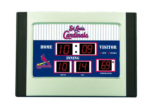 This is a cool looking mini-sized alarm scoreboard clock. Shows the time, date, and temperature and features eight different alarm settings. Measures 6.25"x9.5"x3.5"