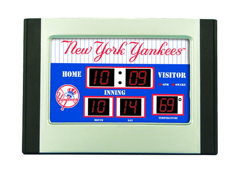 This is a cool looking mini-sized alarm scoreboard clock. Shows the time, date, and temperature and features eight different alarm settings. Measures 6.25"x9.5"x3.5"