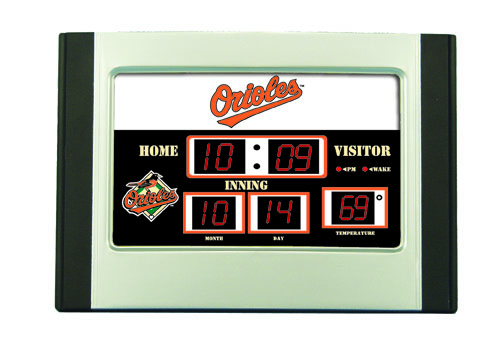 This is a cool looking mini-sized alarm scoreboard clock. Shows the time, date, and temperature and features eight different alarm settings. Measures 6.25"x9.5"x3.5"