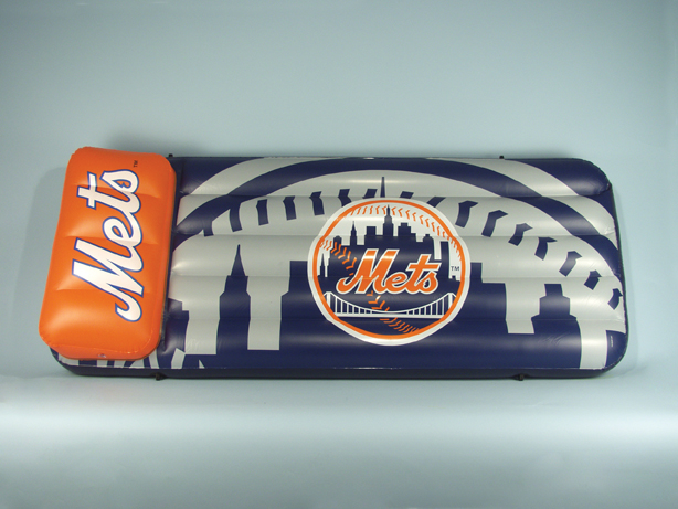 New York Mets Inflatable Swimming Pool Float This 66"x27"x5" Pool Float and Air Mattress is perfect for the beach, pool, or lake. It comes with built in grommets to tie up the lounger. Sturdy I-Beam construction features .25mm polyvinyl and built in angled air pillow with separate air valve.
