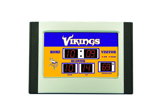 This is a cool looking mini-sized alarm scoreboard clock. Shows the time, date, and temperature and features eight different alarm settings. Measures 6.25"x9.5"x3.5"