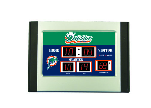 This is a cool looking mini-sized alarm scoreboard clock. Shows the time, date, and temperature and features eight different alarm settings. Measures 6.25"x9.5"x3.5"