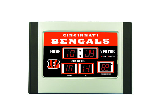 This is a cool looking mini-sized alarm scoreboard clock. Shows the time, date, and temperature and features eight different alarm settings. Measures 6.25"x9.5"x3.5"