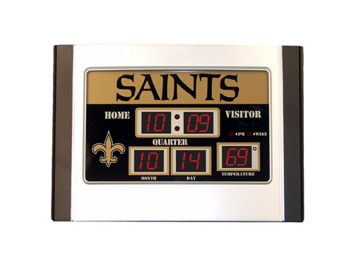 This is a cool looking mini-sized alarm scoreboard clock. Shows the time, date, and temperature and features eight different alarm settings. Measures 6.25"x9.5"x3.5"