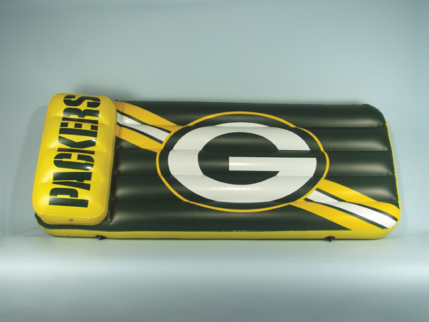 Green Bay Packers Inflatable Swimming Pool Float This 66"x27"x5" Pool Float and Air Mattress is perfect for the beach, pool, or lake. It comes with built in grommets to tie up the lounger. Sturdy I-Beam construction features .25mm polyvinyl and built in angled air pillow with separate air valve.