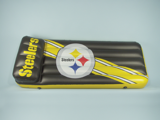 Pittsburgh Steelers Inflatable Swimming Pool Float This 66"x27"x5" Pool Float and Air Mattress is perfect for the beach, pool, or lake. It comes with built in grommets to tie up the lounger. Sturdy I-Beam construction features .25mm polyvinyl and built in angled air pillow with separate air valve.