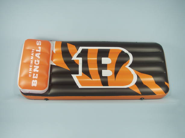 Cincinnati Bengals Inflatable Swimming Pool Float This 66"x27"x5" Pool Float and Air Mattress is perfect for the beach, pool, or lake. It comes with built in grommets to tie up the lounger. Sturdy I-Beam construction features .25mm polyvinyl and built in angled air pillow with separate air valve.