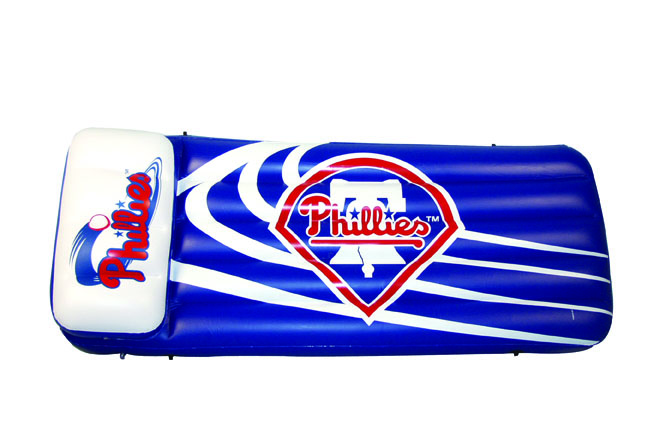 Philadelphia Phillies Inflatable Swimming Pool Float This 66"x27"x5" Pool Float and Air Mattress is perfect for the beach, pool, or lake. It comes with built in grommets to tie up the lounger. Sturdy I-Beam construction features .25mm polyvinyl and built in angled air pillow with separate air valve.
