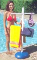 Portable towel rack can setup on the swimming pool deck or by the spa. All weather PVC material. Add sand or water to base for stability.