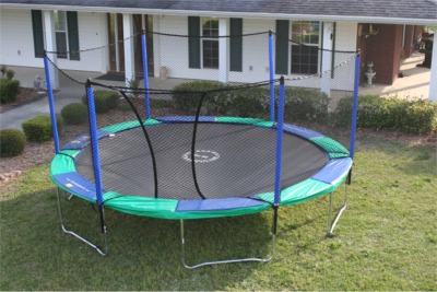 These trampolines have a screened target in the center of the mat to direct the jumper back to the middle of the mat. Heavy duty galvanized frame. Blue and Green 3/4" thick closed cell foam, vinyl coated trampoline frame pads. Sunguard protects the bed from dry rotting as quickly as other trampolines. Free spring tool included.