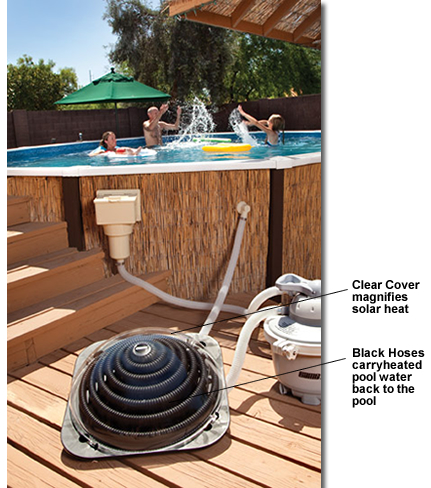 Solar energy is magnified through the clear lens of the heater and captured by black coiled hoses that carry pool water. The solar heated pool water is circulated back to your pool by your own pump & filter system.
