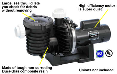 The Max-E-Pro™ is built to last, constructed of Sta-Rite®’s glass reinforced resin that is corrosion-proof and can withstand many years of U.V. sunlight. This season, invest in the energy efficient, low-maintenance pump that really moves the water – Max-E-Pro™ by Sta-Rite®. 110/230V UL Listed and NSF.