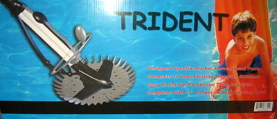 Trident suction side above ground pool vac will clean any above ground pool regardless of shape or depth. With only one moving part, it will remove dirt, twigs, leaves and debris from your pool. It will free you from the chore of vacuuming! Since there is only one moving part, Trident will give you years of maintenance free operation. Simply plug the unit’s hose into your skimmer and Trident effortlessly cleans your pool.