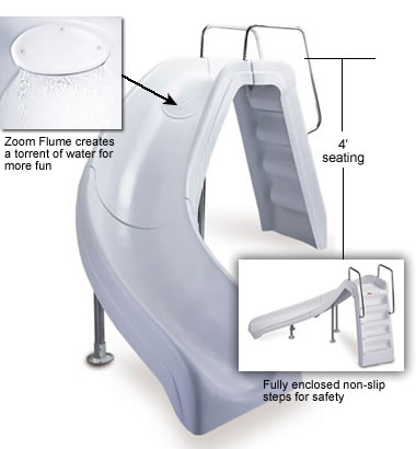 This rugged 4' slide will fit nicely in a screened-in pool or discretely below a six-foot privacy fence. It is also great for families that prefer a safer, lower slide then the 6'6" Wild Ride. Comes equipped with the “Zoom Flume" to deliver gushing water to the slide for a slip sliding great time. The fully enclosed non-skid step provides sure-footed traction and safety for all ages. Rugged stainless steel rails, legs, and hardware provide super strength and long-lasting beauty in all weather conditions. The White Water is manufactured with premium ACTRA™ acrylic that provides superior strength, flexibility and fade-resistance. The White Water will retain its good looks for many years. Backed by a 3-Year Warranty.
