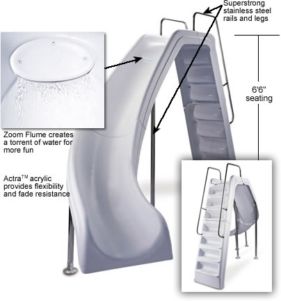 This rugged slide will give you years of wild poolside fun. The Wild Ride measures a full 6'6" and is equipped with the "Zoom Flume" patented water supply system. The "Zoom Flume" delivers gushing water to the slide ensuring a slippery sliding surface for wild excitement and faster action. The fully enclosed non-skid steps ensure safety for all ages. Rugged stainless steel rails, legs and hardware provide strength and long-lasting beauty in all weather conditions. Our slide is manufactured with ACTRA™ acrylic that provides superior flexibility and fade-resistance. The Wild Ride slide will retain its good looks for many seasons. Backed by a 3-Year Warranty.