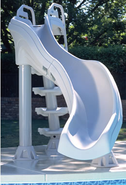 This big slide puts water park excitement in your backyard. This big 6'6" slide with double curves will ensure your family has a blast this season. The patented "Zoom Flume" slashes up to 35 gallons per hour of water down the slide to create slippery heart-pounding excitement. The X-Stream is also built for safety with 5 large non-skid steps and high sidewalls for added protection. The X-Stream slide boasts rugged high quality throughout with a durable resin body that can be easily configured in either a left or right curve. The slide comes complete with plumbing and hardware kit and deck anchors. Available in gray only. Backed by a 3-Year Warranty.