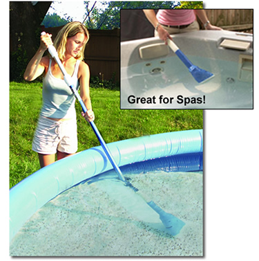 Now you can easily clean the grit and debris from your spa or small pool with the Aqua Broom. This powerful cleaner uses battery power to provide up to 3 hours of cleaning time. All debris is vacuumed into the unit's own reusable, easy to clean filter bag. Aqua Broom is light weight (3 lbs) and can be hand held in the shallow areas or attached to a telepole ( Not Included) for deeper parts of your spa or swimming pool.