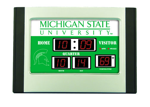 This is a cool looking mini-sized alarm scoreboard clock. Shows the time, date, and temperature and features eight different alarm settings. Measures 6.25"x9.5"x3.5" . Normally ships in 3-5 business days.