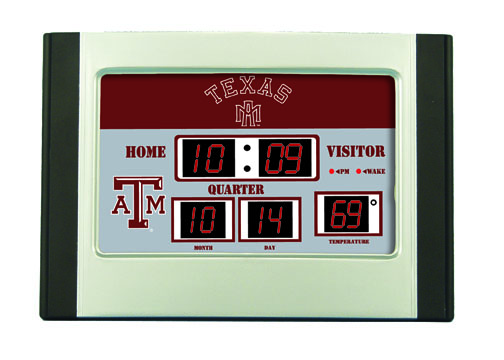 This is a cool looking mini-sized alarm scoreboard clock. Shows the time, date, and temperature and features eight different alarm settings. Measures 6.25"x9.5"x3.5" . Normally ships in 3-5 business days.