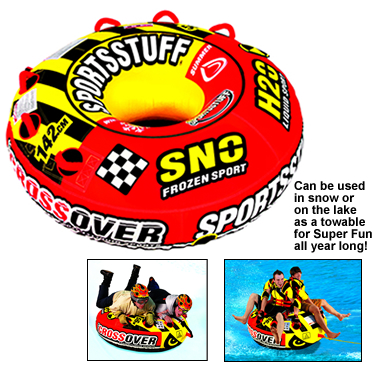 Hit the slopes or cruise the waves with our new Super Crossover! Year-round fun for 1 or 2 riders, this multi-purpose tube sports a PVC tarpaulin bottom for super speed. Its double-webbing foam handles with knuckle guards make holding on easy & comfortable. Our Super Crossover is made of heavy duty PVC material with a double stitched partial nylon cover. Features include a tote strap, speed valve & a reinforced tow system. Fly down your favorite sledding hill or use it on the lake as a towable – Super Crossover is a sure hit all year long! 1-2 riders